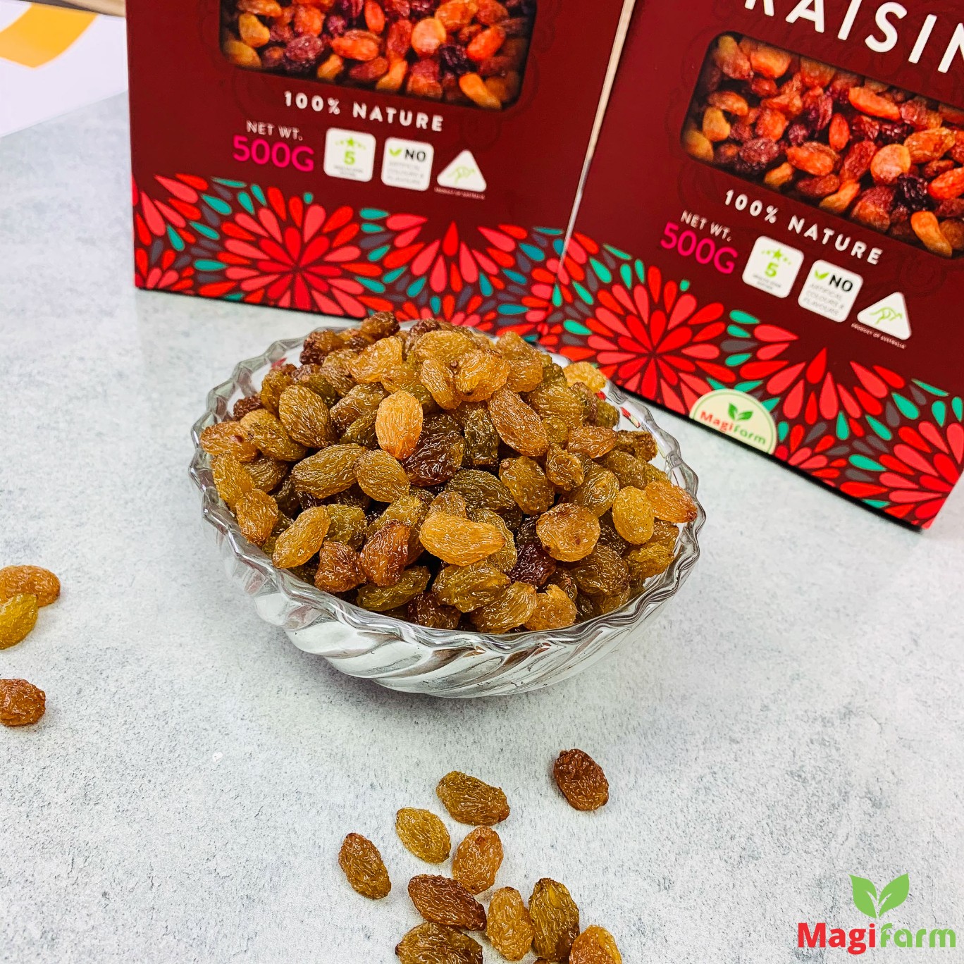 Nho khô Úc được thu hái sau mùa vụ tại bang Victoria, vùng được xem là thổ nhưỡng trồng nho ngon nhất thế giới, được nhập khẩu từ 3 dòng nho Thompson, Crimson và Sun Muscat. Đây là 3 giống nho ngon nhất, đem lại hàm lượng chất dinh dưỡng cao nhất trong các giống nho trên thế giới.