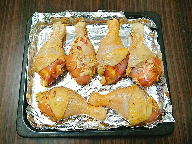 - Ngày hôm sau bạn lấy túi đùi gà ra, khuôn lót giấy nhôm, để gà đã ướp chung với nghệ kèm thêm hỗn hợp nước ép của nghệ vào khuôn rồi cho vào lò nướng ở nhiệt độ 180ºC, nếu không có lò nướng bạn có thể nướng trên than hoa thì càng ngon hơn nữa..